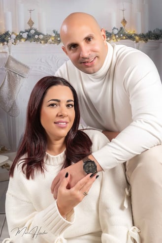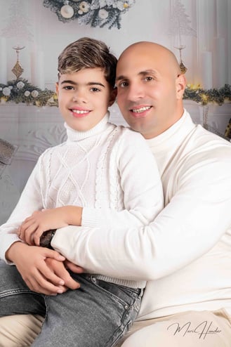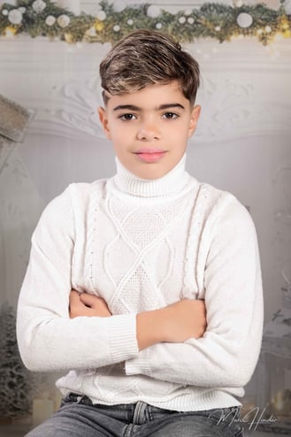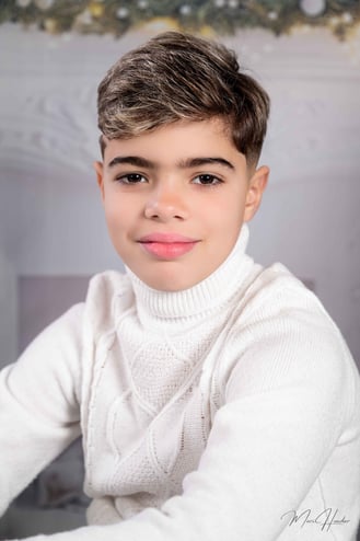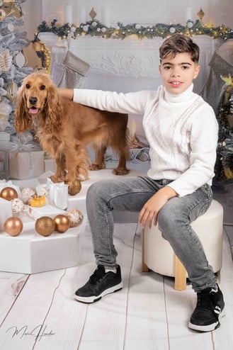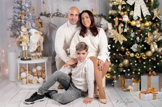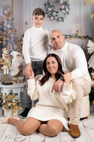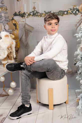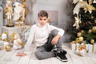 Diseñamos dos escenarios únicos para capturar la esencia de esta familia. El primero fue un montaje navideño lleno de calidez y magia. Utilizamos luces suaves, props temáticos y una paleta de colores que evocaban el espíritu festivo. El hijo, lleno de entusiasmo, posó junto al árbol de Navidad y otros elementos decorativos que hicieron brillar su carácter alegre.